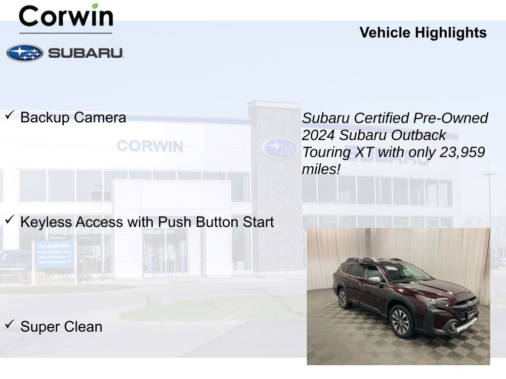 The NEW Corwin Subaru! Same great location, same great staff, best selection! Come see what the Corwin Subaru Family Driven experience is all about! 2024 Dark Mahogany Pearl Subaru Outback Certified. Touring XT
