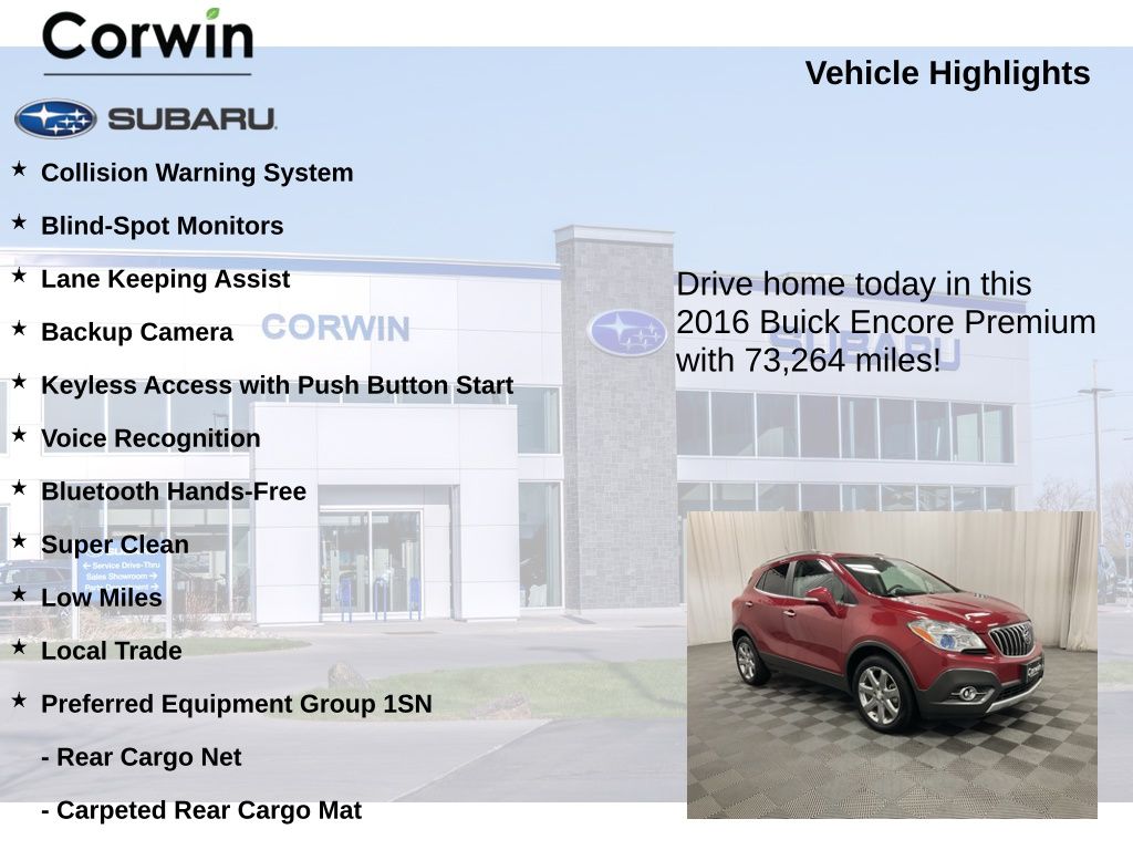 Whether you're navigating the city streets or embarking on a weekend adventure, the 2016 Buick Encore Premium is the perfect companion. With its versatile cargo space, all-wheel-drive capability, and host of convenience features, this crossover is ready to adapt to your every need.