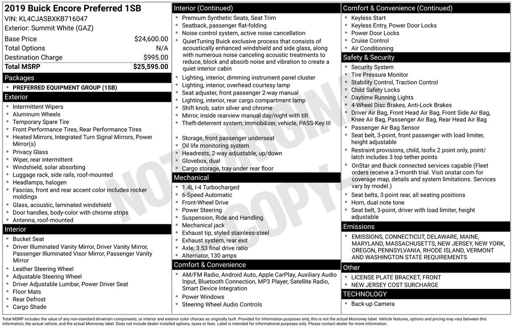 With its impressive list of features, efficient powertrain, and sleek design, this 2019 Buick Encore Preferred is the perfect blend of practicality and sophistication. Experience the difference for yourself and schedule a test drive today. We're confident you'll be impressed by the value and capabilities this Encore Preferred has to offer.