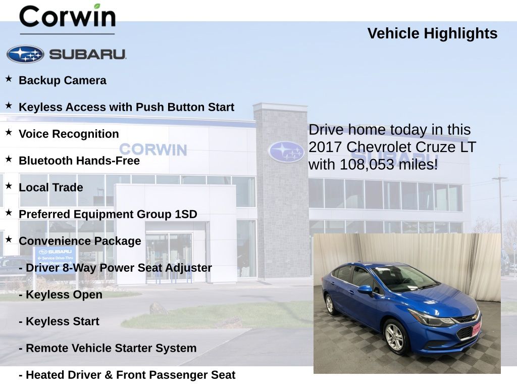 Discover the perfect blend of style, technology, and efficiency in this 2017 Chevrolet Cruze LT. With its sleek Blue exterior and well-appointed interior, this compact sedan is ready to elevate your driving experience.