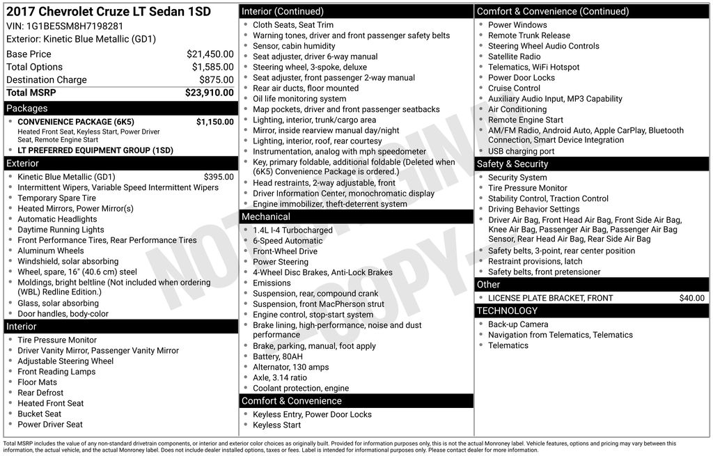 This Cruze also comes equipped with the Convenience Package, offering a range of desirable features: