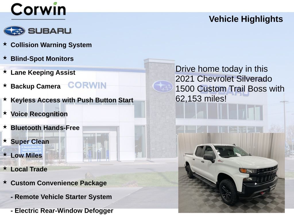 With its impressive capabilities, striking good looks, and comprehensive suite of features, this 2021 Chevrolet Silverado 1500 Custom Trail Boss is the perfect companion for your next adventure. Experience the perfect blend of power, technology, and style â" schedule a test drive today and discover the difference for yourself.