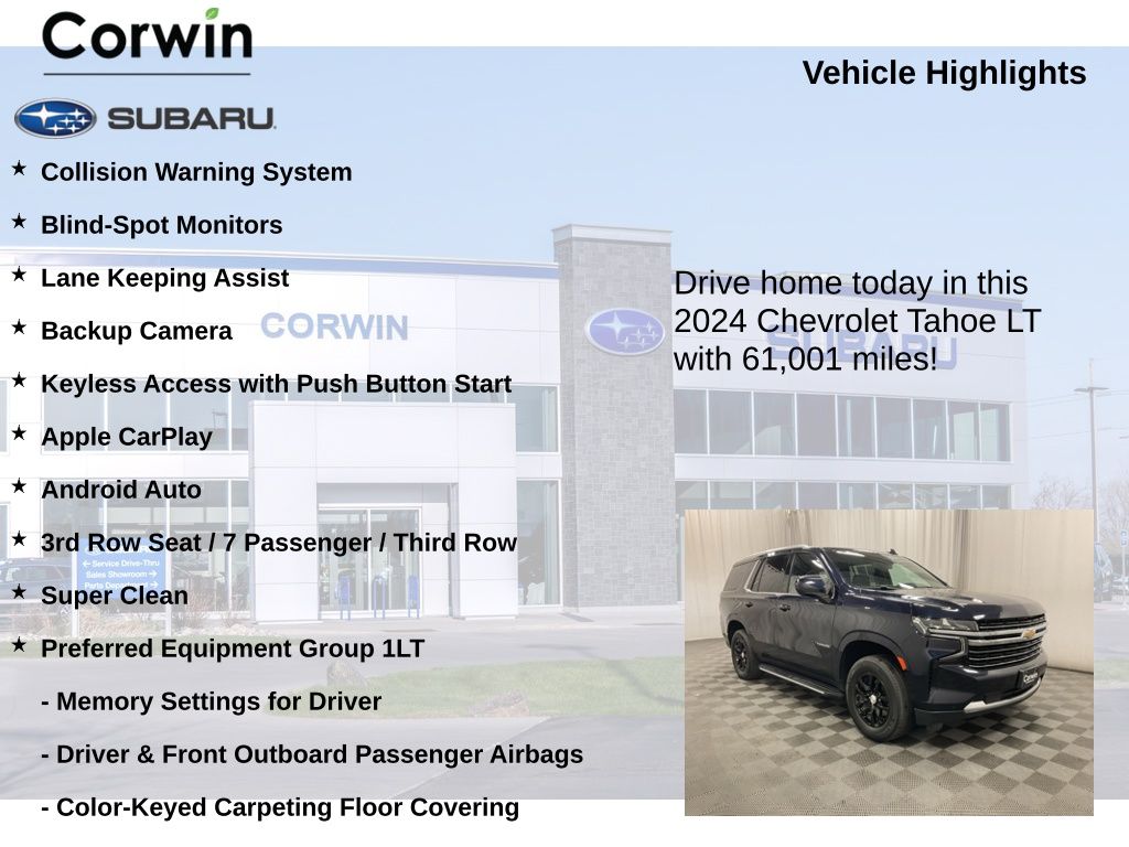 This well-equipped 2024 Chevrolet Tahoe LT is available now for the remarkable price of $48,998. Experience the perfect blend of power, technology, and versatility by scheduling a test drive today. We're confident you'll be impressed by this exceptional SUV.