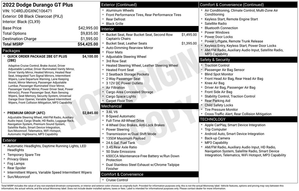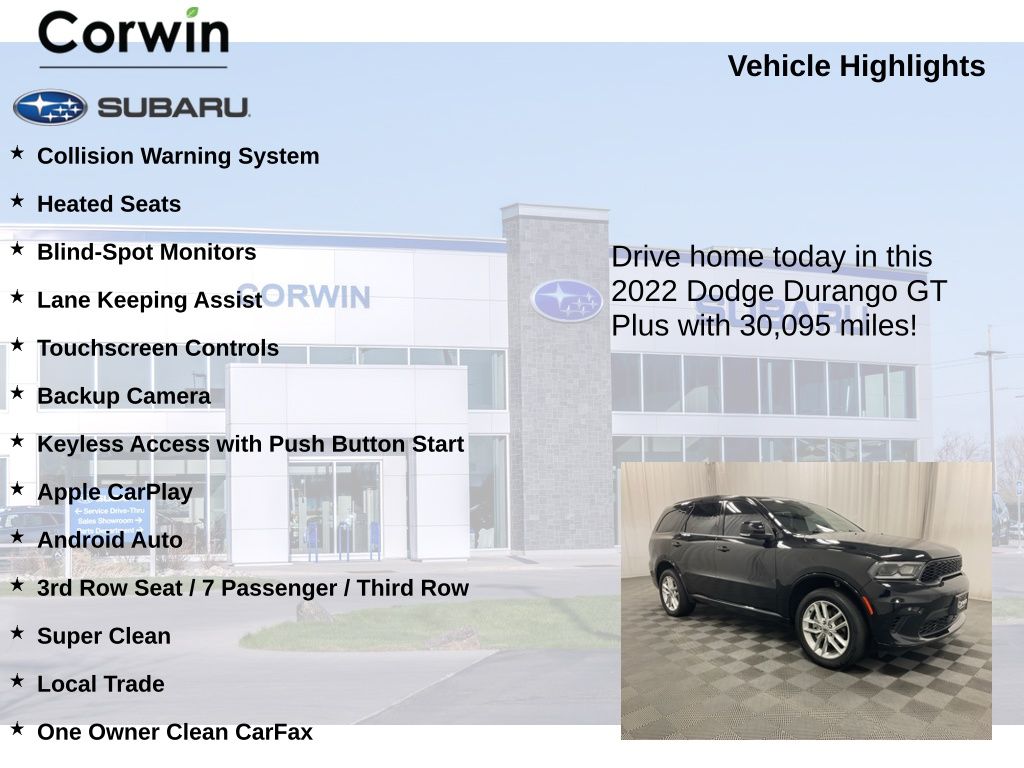 Step inside this meticulously maintained, one-owner Durango and experience the perfect blend of power, versatility, and premium comfort. With its spacious interior, advanced technology, and exceptional safety features, this SUV is ready to elevate your driving experience. Schedule a test drive today and discover why the 2022 Dodge Durango GT Plus is the perfect choice for your next adventure.