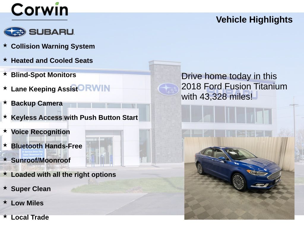 With a low mileage of just 43,327, this 2018 Ford Fusion Titanium is a true gem. It's a local trade-in, meticulously maintained, and ready to provide you with years of reliable and enjoyable driving. Don't miss the opportunity to experience the exceptional craftsmanship and advanced features of this exceptional vehicle.