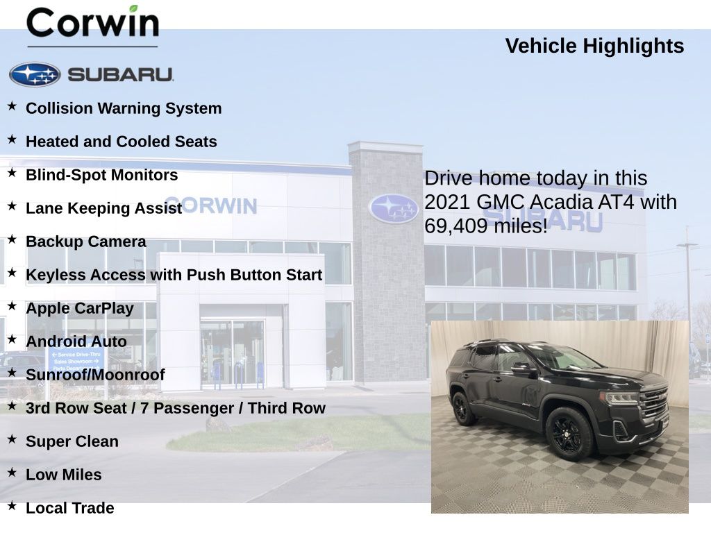 Elevate your driving experience with this exceptional 2021 GMC Acadia AT4. This versatile and well-equipped SUV is the perfect blend of style, performance, and advanced technology, making it an ideal choice for the discerning driver.