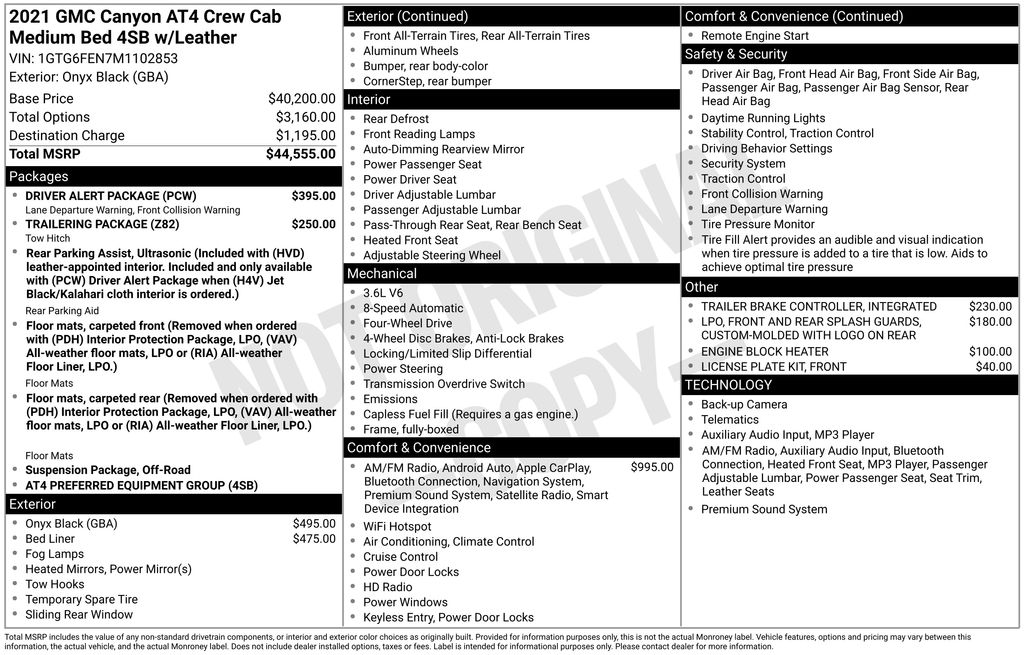 Boasting a striking Onyx Black exterior and a sleek Black interior, this GMC Canyon AT4 w/Leather exudes a bold, confident presence. The custom-molded front and rear splash guards with the GMC logo add a touch of style and protection, while the engine block heater ensures reliable performance in colder climates.