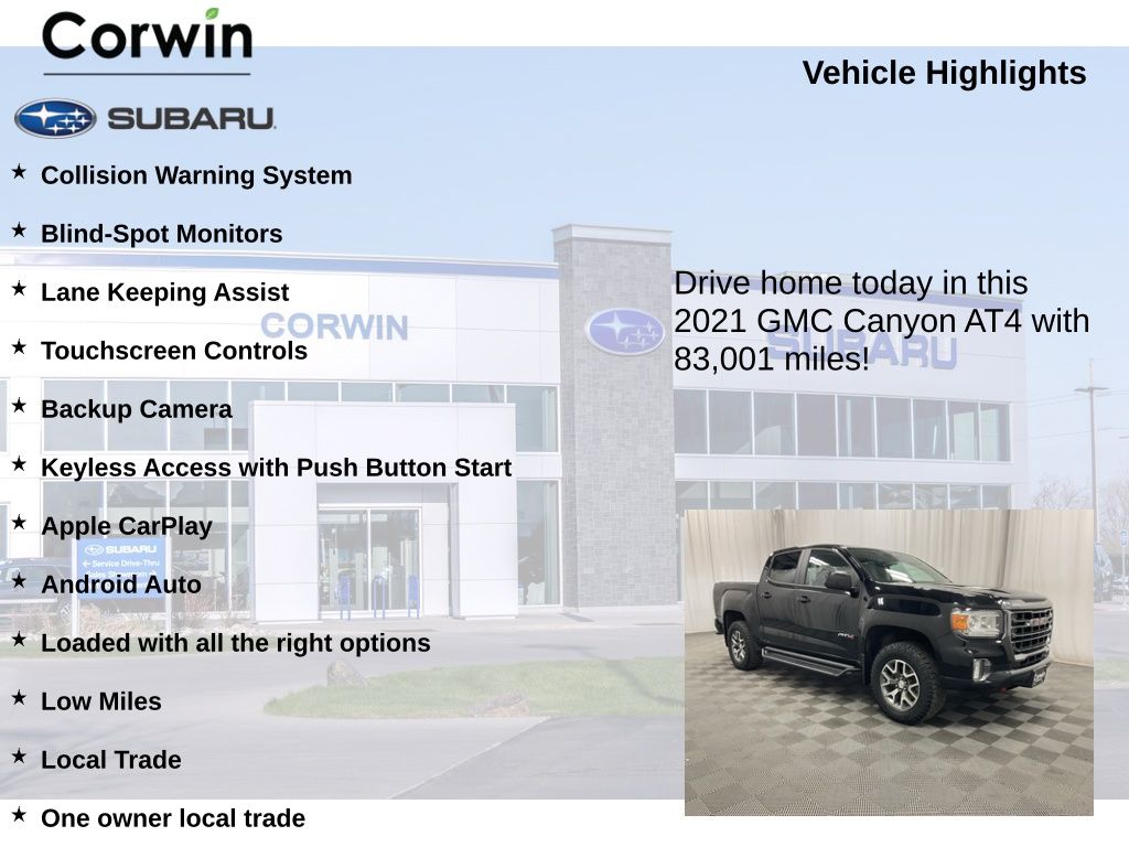 Whether you're tackling rugged off-road trails or navigating the daily commute, the 2021 GMC Canyon AT4 w/Leather is the perfect blend of capability and comfort. With its impressive features and low mileage, this one-owner local trade-in is an exceptional value. Visit our showroom today and experience the power and versatility of the Canyon AT4 for yourself.
