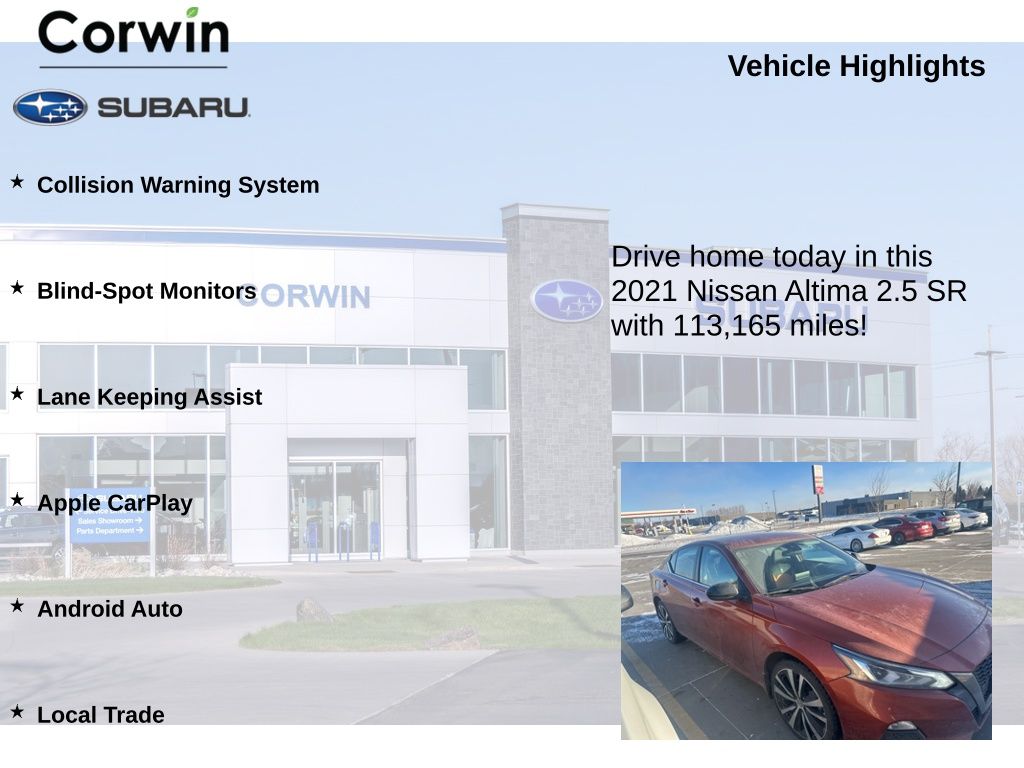Combining style, performance, and advanced technology, this 2021 Nissan Altima 2.5 SR is the perfect choice for the discerning driver who demands more from their vehicle. Experience the difference for yourself and schedule a test drive today. We're confident you'll be impressed by all this Altima has to offer.