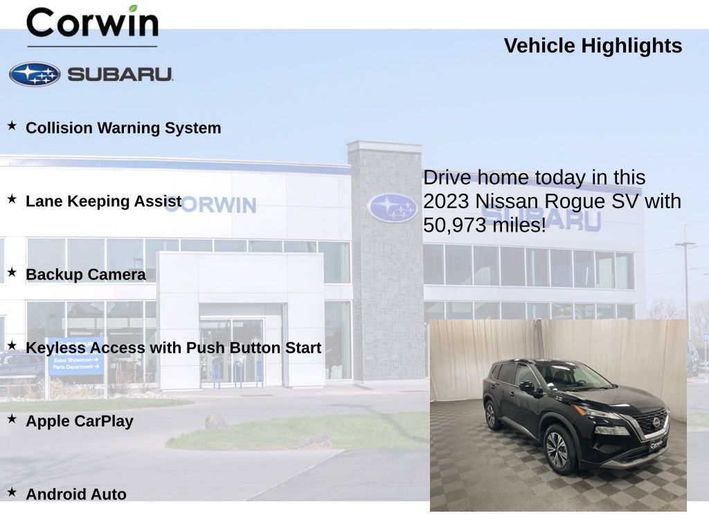 Priced below KBB Fair Purchase Price! The NEW Corwin Subaru! Same great location, same great staff, best selection! Come see what the Corwin Subaru Family Driven experience is all about! 2023 Black Nissan Rogue SV