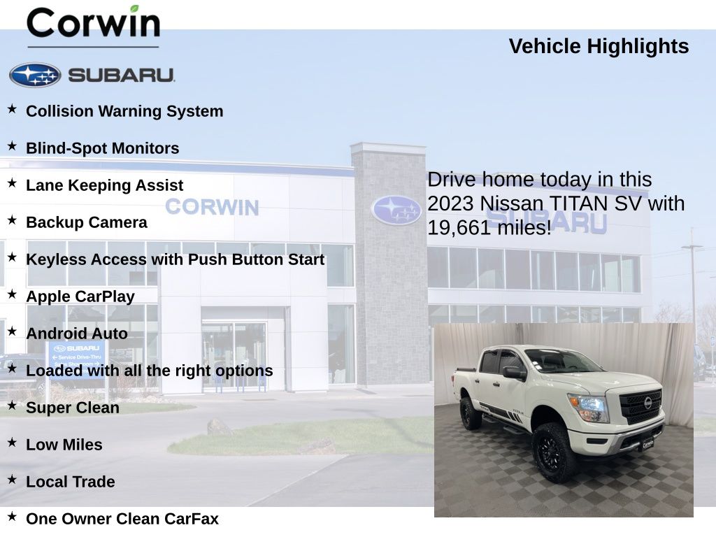 Discover the power and capability of the 2023 Nissan Titan SV. This impressive full-size pickup boasts a commanding 5.6L V8 engine that delivers an impressive 400 horsepower, paired with a smooth-shifting 9-speed automatic transmission and robust 4-wheel drive system. With a spacious and well-appointed interior, the Titan SV offers the perfect blend of utility and comfort for your active lifestyle.