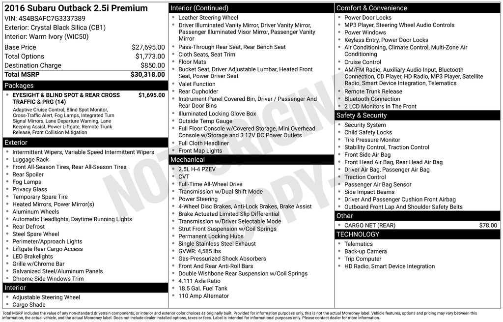 Whether you're tackling the daily commute or embarking on a weekend adventure, this 2016 Subaru Outback 2.5i Premium is ready to exceed your expectations. With its impressive safety ratings, advanced technology, and versatile utility, it's the perfect blend of form and function. Visit our showroom today and experience the exceptional quality and value of this exceptional Outback.