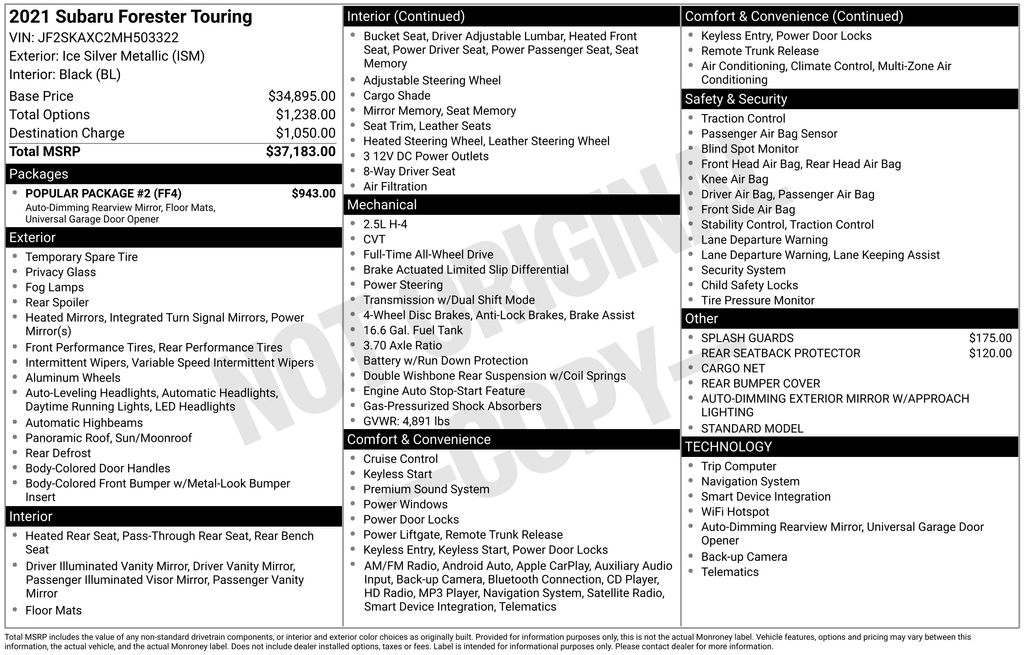 Discover the perfect blend of style, capability, and technology in this stunning 2021 Subaru Forester Touring. This SUV is more than just a practical choice â" it's a true embodiment of Subaru's commitment to exceptional engineering and innovative features.