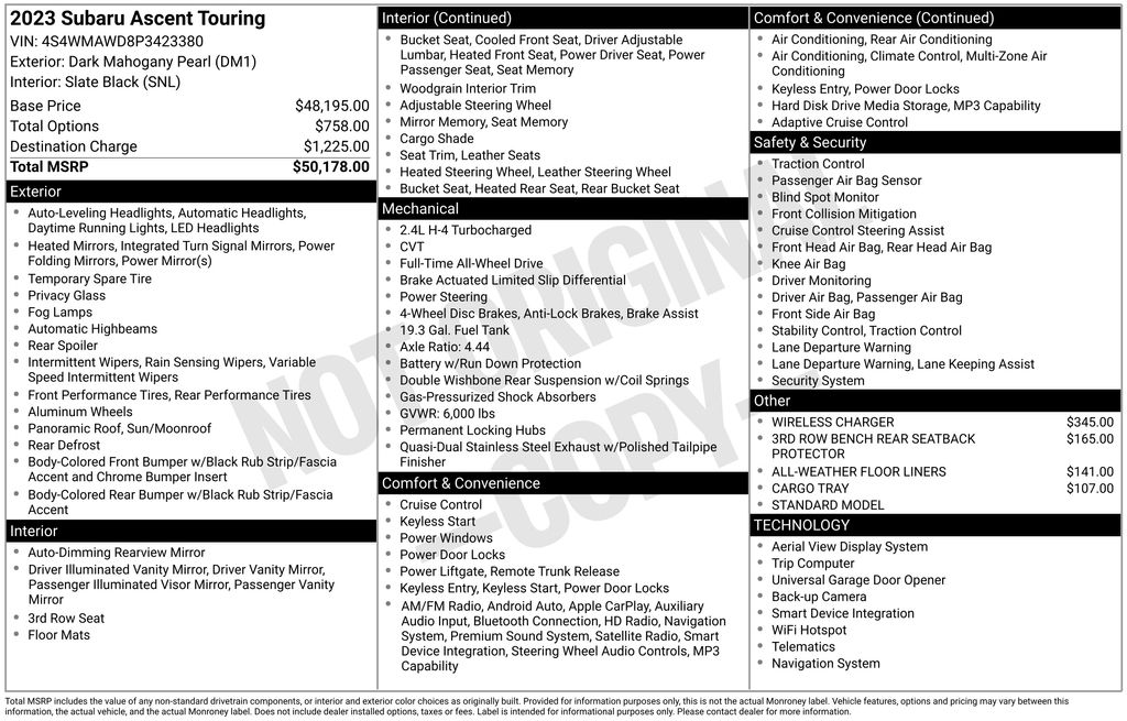 With its exceptional blend of style, performance, and advanced features, this 2023 Subaru Ascent Touring is a true standout in the SUV segment. Experience the difference for yourself and schedule a test drive today. We're confident you'll be impressed by the unparalleled value and exceptional ownership experience this vehicle has to offer.