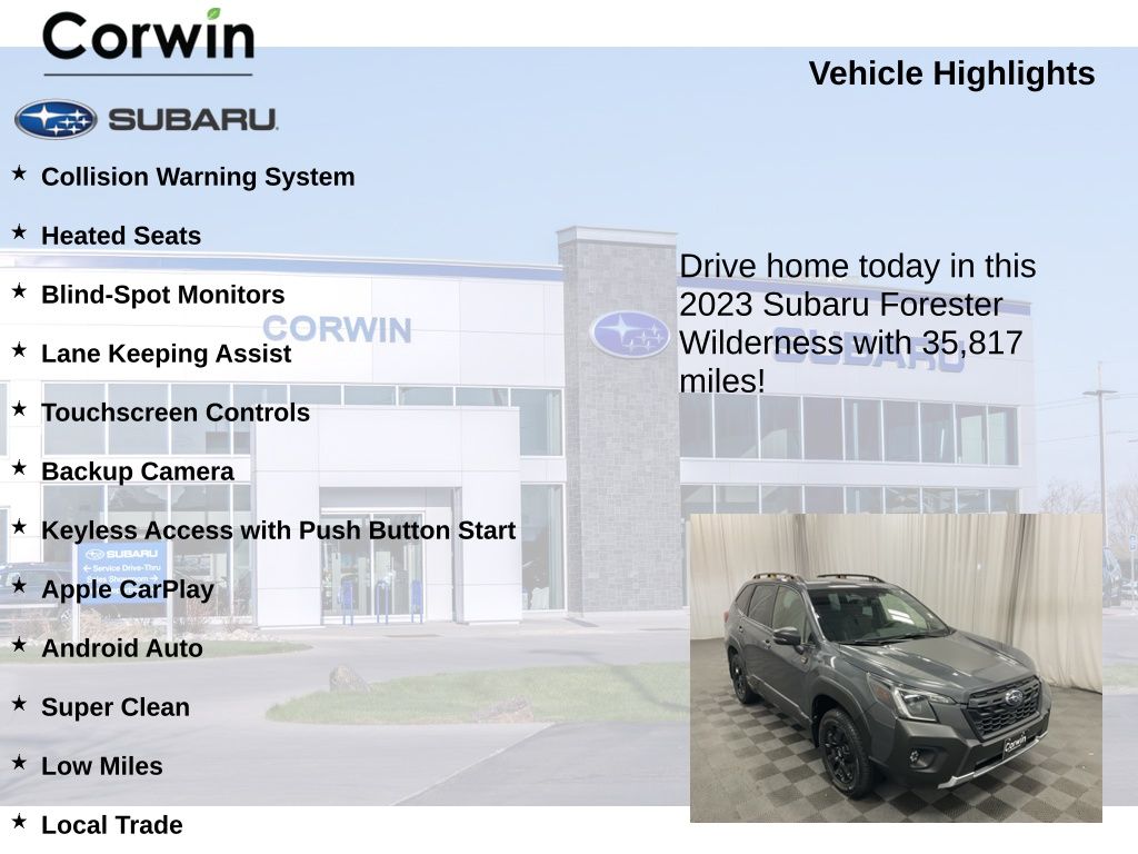 This Subaru Forester is well equipped and includes the following features and benefits, Collision Warning System, Heated Seats, Blind-Spot Monitors, Lane Keeping Assist, Touchscreen Controls, Backup Camera, Keyless Access with Push Button Start, Apple CarPlay, Android Auto, Super Clean, Low Miles, Local Trade, Auto-Dimming Exterior Mirror w/Approach Light, Auto-Dimming Mirror w/Compass & HomeLink, Cargo Sidewall Protector, Rear Bumper Cover, Rear Seatback Protector - Wilderness, Wilderness Package. 25/28 City/Highway MPG