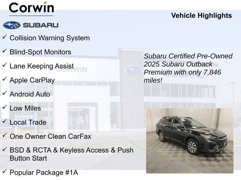 This Subaru Certified Pre-Owned Outback has undergone a rigorous 152-point inspection and comes with a comprehensive warranty, roadside assistance, and additional benefits to provide you with peace of mind. With only 7,846 miles, this one-owner vehicle is in exceptional condition and ready to deliver years of reliable performance.