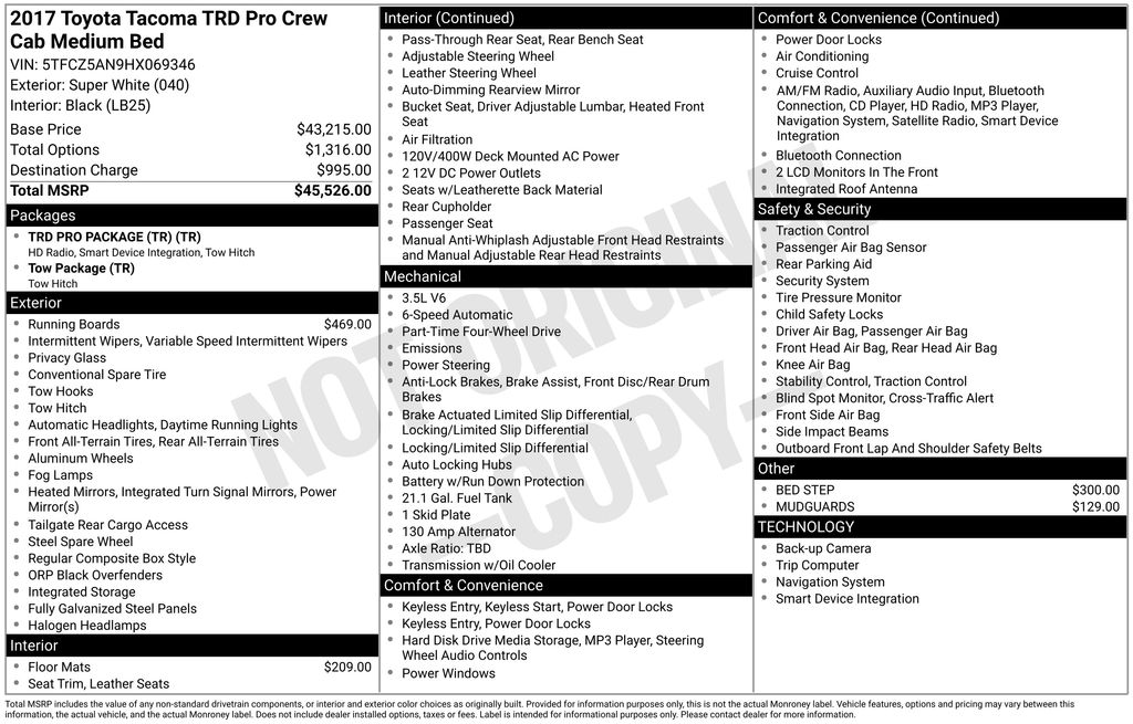 With its impressive capabilities, refined design, and array of advanced features, the 2017 Toyota Tacoma TRD Pro is the perfect blend of rugged performance and modern sophistication. Experience the thrill of owning this exceptional vehicle and discover the true essence of adventure. Visit our showroom today to schedule a test drive and make this Tacoma TRD Pro yours.