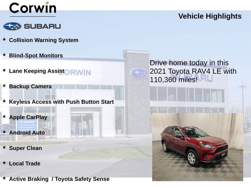 Discover the exceptional value of this 2021 Toyota RAV4 LE. With its impressive performance, advanced safety features, and comprehensive list of desirable amenities, this versatile SUV is an outstanding choice for discerning buyers seeking a well-rounded, reliable, and practical vehicle.