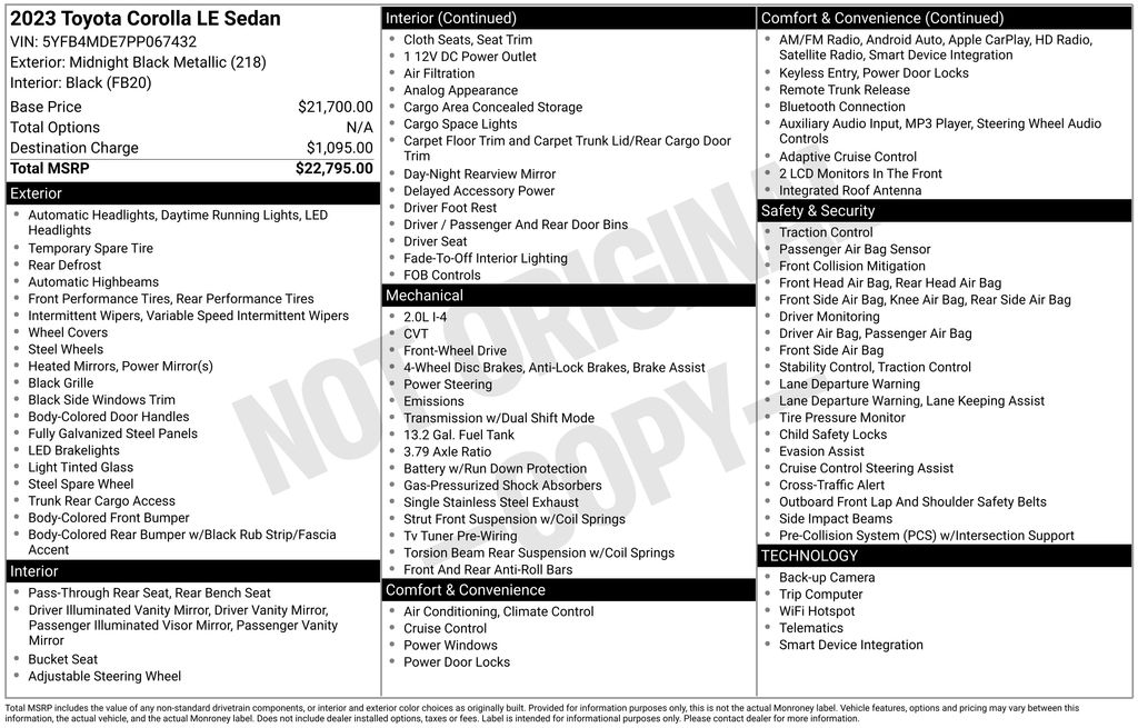 Boasting a sleek and sophisticated exterior in a stunning Black finish, the 2023 Corolla LE commands attention on the road. Under the hood, the efficient 2.0L I4 DOHC 16V engine, paired with a CVT transmission and front-wheel drive, delivers an impressive 32 city and 41 highway MPG, ensuring you can go further on every tank.